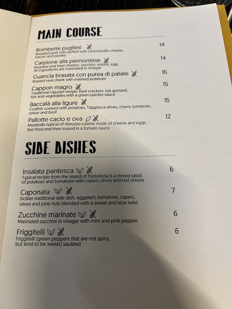 The menu also includes a variety of meat dishes, such as the Ox Cheek, slow-cooked to perfection, and Brustengo Con Crudo Di Norcia, a delicious fried bread stuffed with cured meats. For something lighter, Sarde In Saor, marinated sardines with onions and vinegar, offers a tangy and fresh option. The Pallotte are comforting meatballs in a rich tomato sauce, while Creme Caramel provides a silky dessert to end the meal.